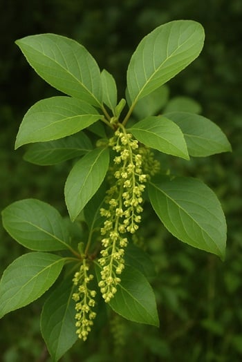 Cascara is a deciduous tress and is medium-sized. It grows 30 feet high with slender branches and a reddish-brown bark. Its elliptical leaves are yellow-green with jagged edges and cluster at the tip of the branchlets. In May and June the tree blooms with attractive green and white flowers and in September sprouts round and black, berry-like fruits.