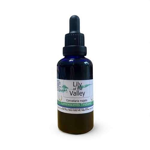Lily of the Valley (Convallaria majalis), the leaves from which this tincture is extracted, is a deliciously and sweetly scented but highly toxic woodland (therefore partial shade loving) flowering plant. It is a native throughout the cool and temperate Northern Hemiphere in Asia, and Europe. all plant parts are toxic including the red berries that it sometimes forms after flowering